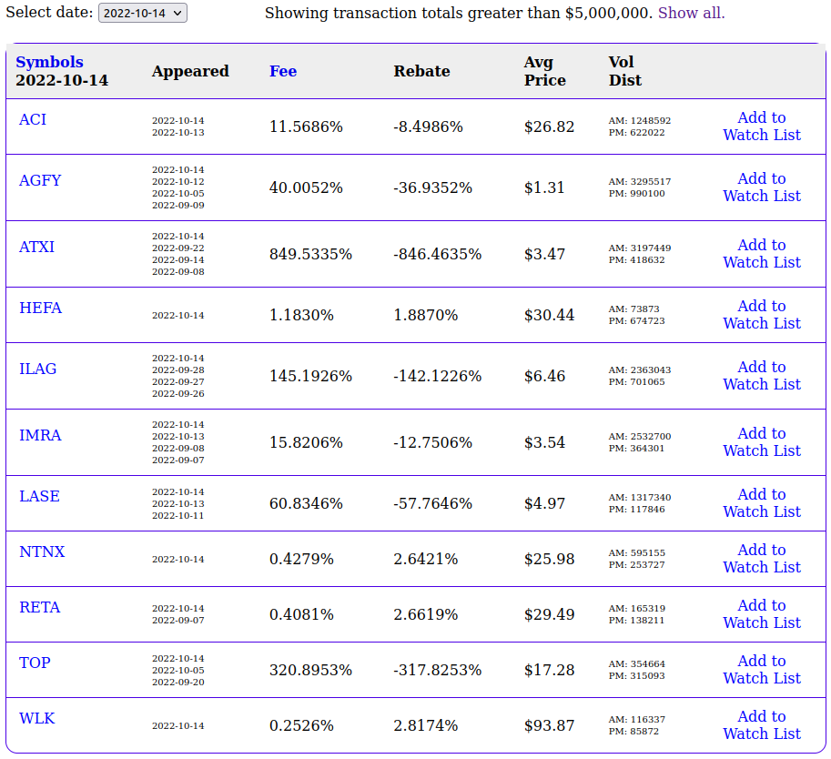 There's a lot of information here so let me unpack it a bit. First of all, you can sort the list by ticker symbol (as it is here) or by fee rate. I tend to focus on stocks with high fee rates (I usually ignore anything under 10%), and I also generally exclude ETFs. Quite a few ETFs appear on these screens.